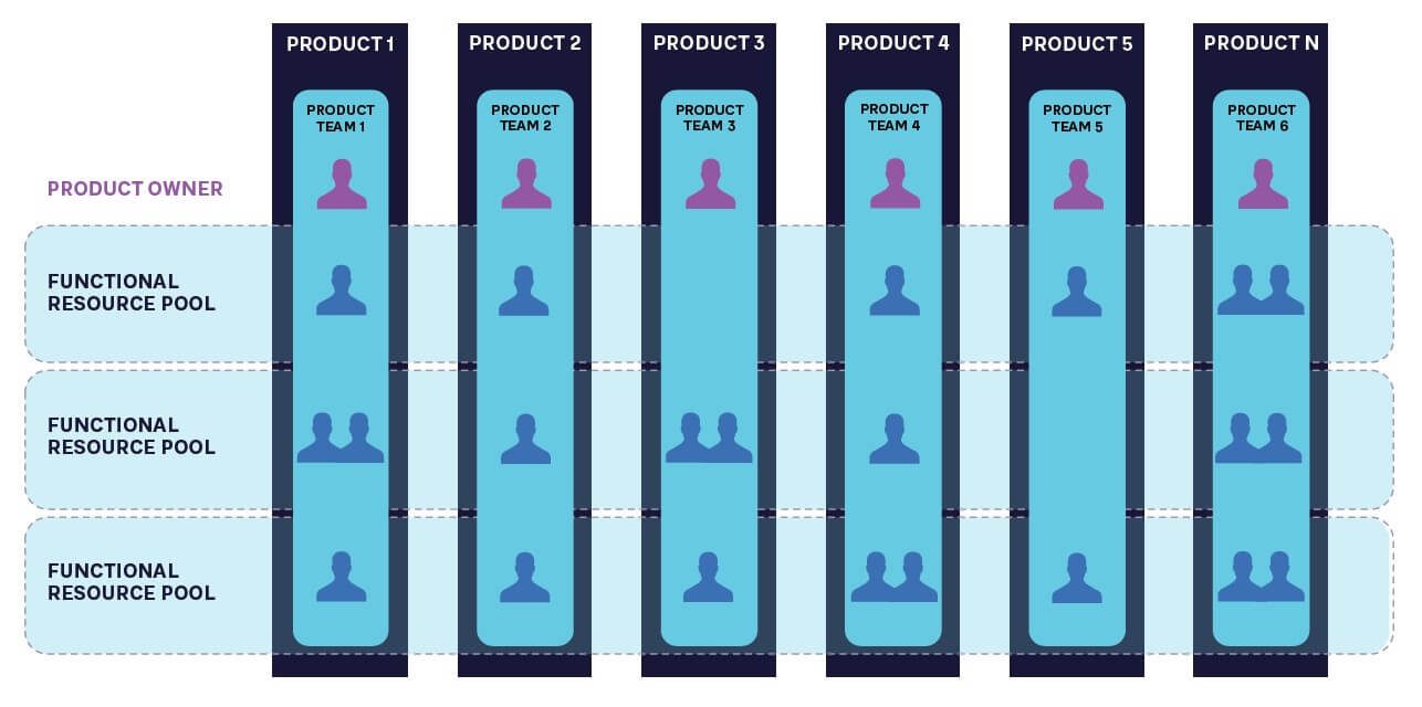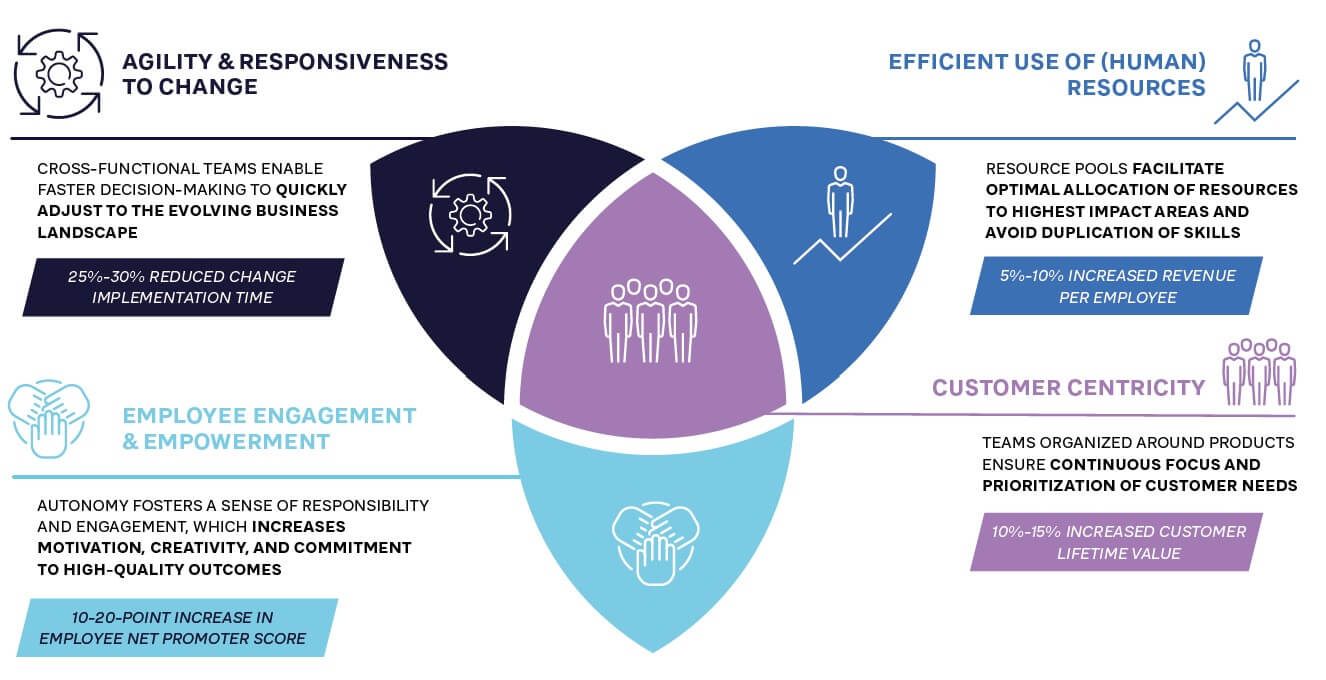 By organizing people in resource pools, companies can optimally allocate their workforce to areas where they have the highest impact and avoid duplication of skills in multiple departments. Furthermore, each product team operates with clear, outcome-based quarterly goals (measurable OKRs) and corresponding budgets, allowing for better cost control and resource waste reduction, which can occur in more siloed or fragmented organizational structures.