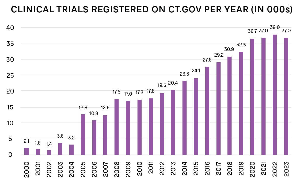 - For many conditions, approved, effective drugs are already available, which lowers the incentive for patients to take part in a new trial with unknown benefits. The number of new trials is also increasing overall, as shown in Figure 2.