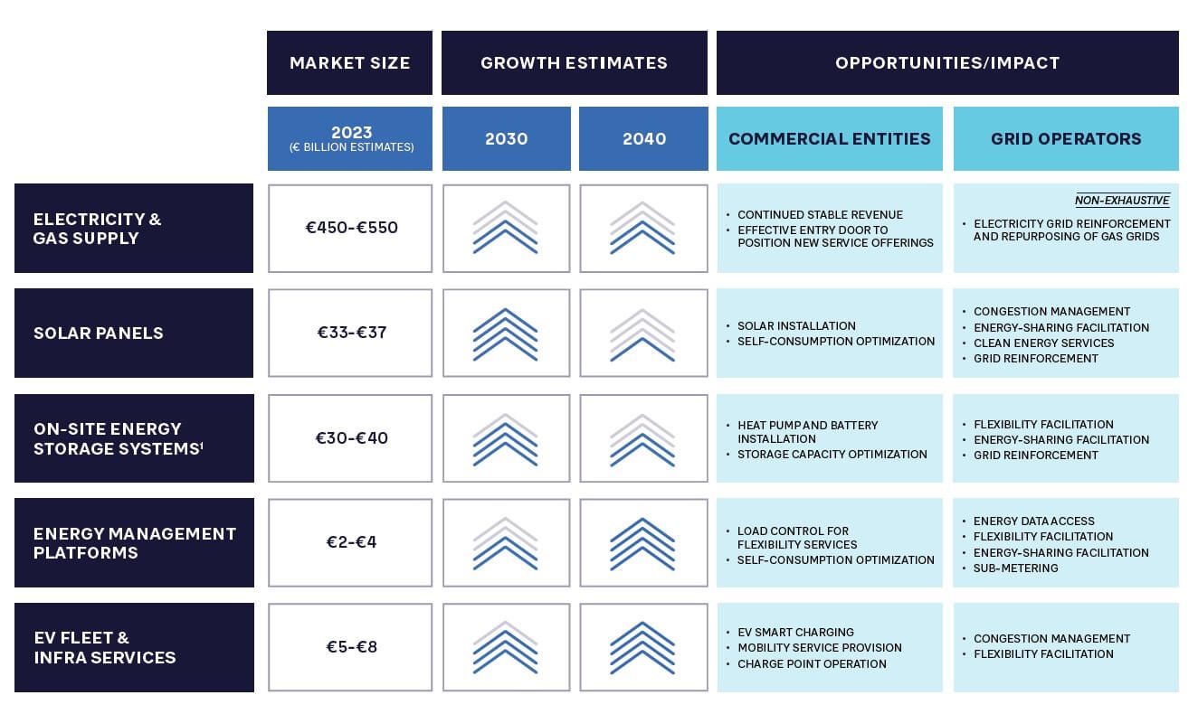Decentralization and the energy transition are changing what customers expect from their utilities and, therefore, the services companies must offer. For instance, the value of energy transition-related products and services, such as solar panels and battery storage, is expected to grow significantly in the EU over the next decades (see Figure 1). This growth presents a major opportunity for commercial entities to diversify their revenue streams. However, it also significantly impacts grid operators, requiring them to rethink their integration into the network.